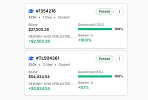 Der Großteil der angebundenen Kundenkonten besteht die jeweiligen Phasen und erreicht das Funding. Grundlage dafür ist eine konsequente Einhaltung der vorgegebenen Regeln – insbesondere in Bezug auf Drawdown, Risiko pro Trade und Gewinnziele.